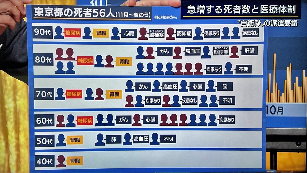 東京都で11月以降に確認された死者56人について、年代別だと80代が最も多く19人でした。基礎疾患があったのは52人で、そのなかでも糖尿病が8人、腎臓疾患が7人と目立っています。