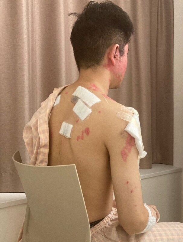 「あまり気持ちの良いものじゃないですが……」。9月中旬にオンラインでの取材に応じた男性は遠慮がちに全治6カ月のけがの状態を記者に見せた。右半身を中心にやけどの痕が残り、肩や背中、右腕は大きなガーゼで覆われていた。右耳には大きなかさぶたが目立つ。顔は右半分が赤く変色し、画面越しでも痛々しい。視力も低下し、片方の目は医療用コンタクトレンズをつけないと見えない状態という。