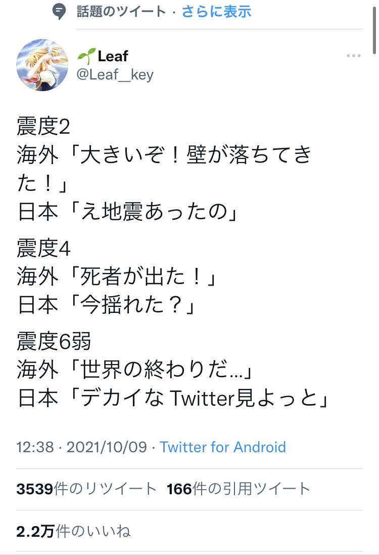 【速報】震度2海外「大きいぞ!壁が落ちてきた!」日本「え地震あったの」→ 2021/12/12 なんJ 震度2海外「大きいぞ!壁が落ちてきた!」日本「え地震あったの」1: 風吹けば名無し 2021/12/12(日) 12:48:30.74 ID:z+3onUUPp1212 続きを読む