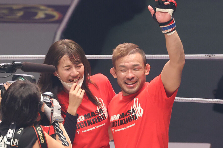勝てば恋人へのプロポーズを予告していた扇久保は、勝利が決まると感無量の表情で喜びに浸った。