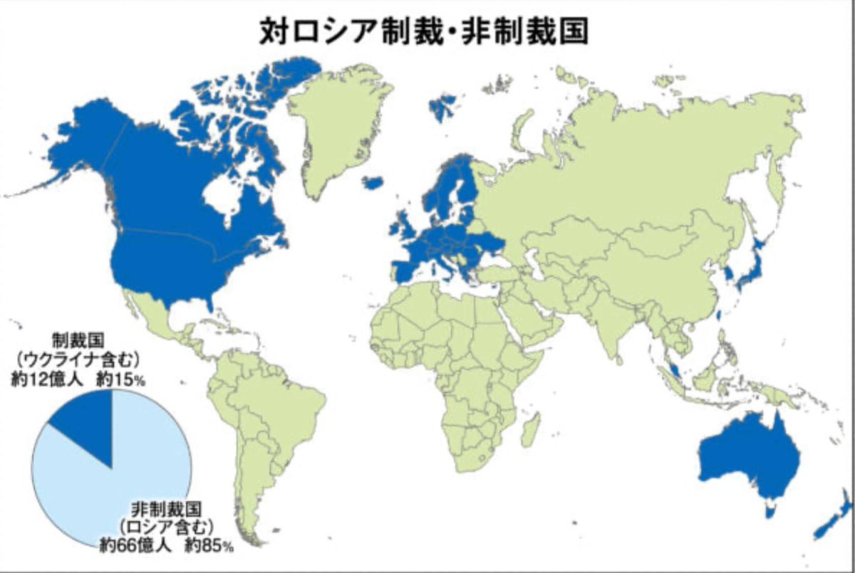 マスコミの報道を観ると、世界中がロシア🇷🇺を批判しているような勢いだが、実際は人口85%の国々が、欧米とはそれぞれの事情があり制裁していない。